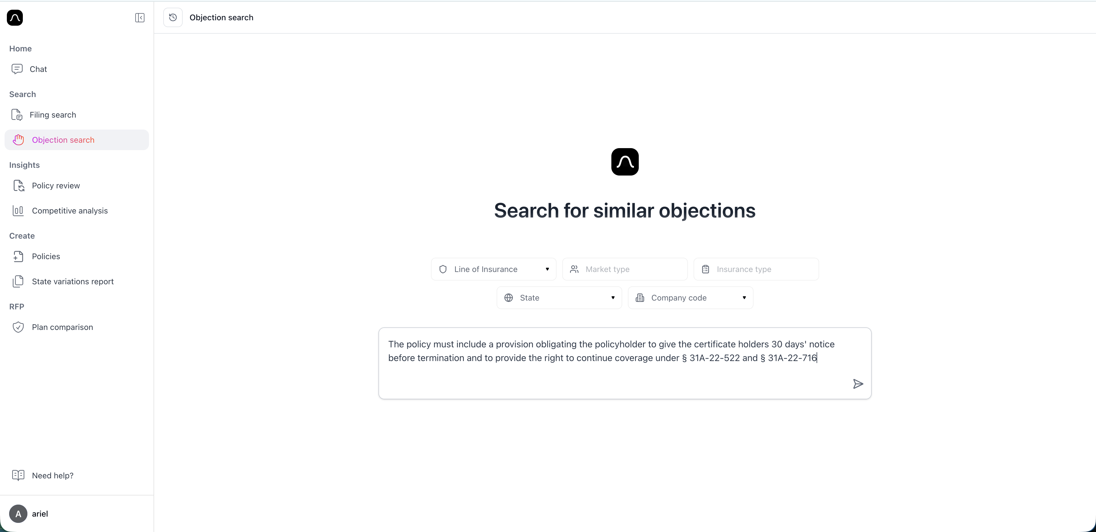 Instead, copy a specific objection paragraph—such as from SERFF correspondence—and paste it directly into the search bar.